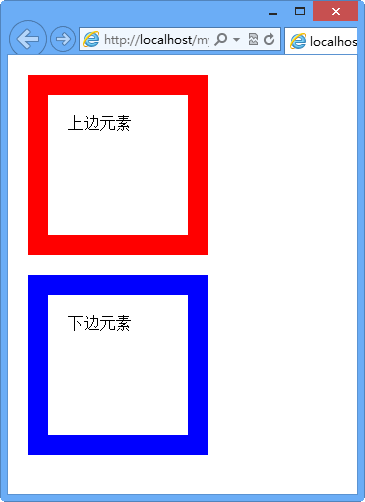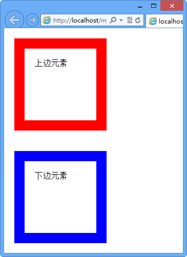 在IE中浏览,上下元素边界发生重叠现象。这与上边元素不浮动,下边元素浮动所讨论的结论是不同的,在其他浏览器中也具有相同的显示效果。