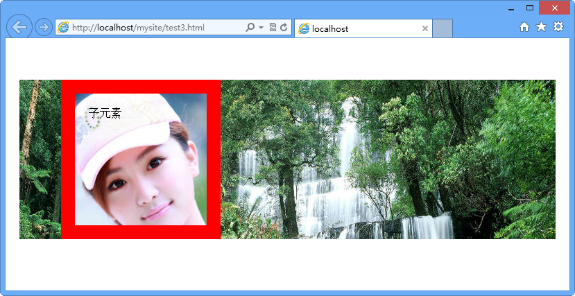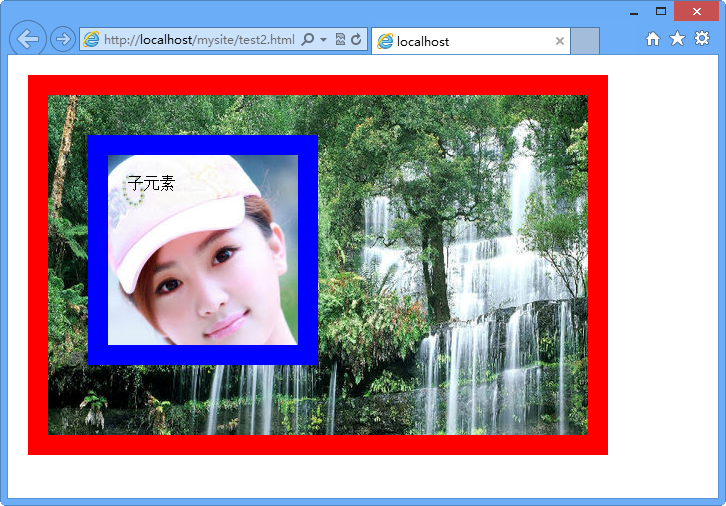 【示例7】下面示例设计当定义了父元素的边框或补白后,会看到子元素自动停靠在父元素内容框的左上角,如图17所示(test2.html)。如果内容框内前面包含其他对象,则自动向下分布。子元素的边界、边框和补白都被包含在内容框里。不管父、子元素是否或独立浮动显示,这种效果在不同浏览器中显示是相同的。