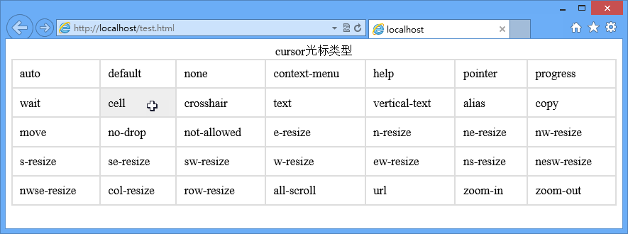 【示例5】下面示例在内部样式表中定义多个鼠标指针类样式,然后为表格单元格应用不同的类样式,完整代码可以参考本节示例源代码,示例演示效果如图5所示。