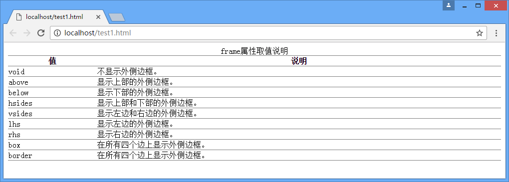 <table border="1" frame="hsides" rules="rows" width="100%"> <caption>frame属性取值说明</caption> <tr><th>值</th><th>说明</th></tr> <tr><td>void</td><td>不显示外侧边框。</td></tr> <tr><td>above</td><td>显示上部的外侧边框。</td></tr> <tr><td>below</td><td>显示下部的外侧边框。</td> </tr> <tr><td>hsides</td><td>显示上部和下部的外侧边框。</td></tr> <tr><td>vsides</td><td>显示左边和右边的外侧边框。</td></tr> <tr><td>lhs</td><td>显示左边的外侧边框。</td></tr> <tr><td>rhs</td><td>显示右边的外侧边框。</td></tr> <tr><td>box</td> <td>在所有四个边上显示外侧边框。</td></tr> <tr><td>border</td><td>在所有四个边上显示外侧边框。</td></tr> </table>