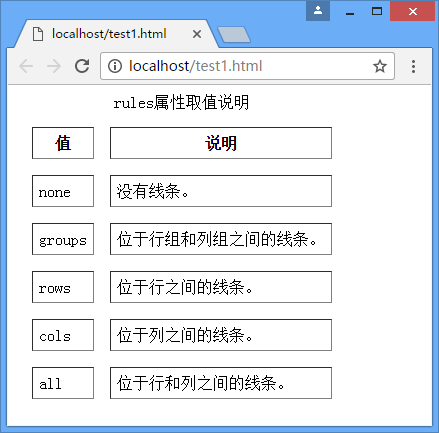<table border="1" frame="void" cellpadding="6" cellspacing="16"> <caption>rules属性取值说明</caption> <tr><th>值</th><th>说明</th></tr> <tr><td>none</td><td>没有线条。</td></tr> <tr><td>groups</td><td>位于行组和列组之间的线条。</td></tr> <tr><td>rows</td><td>位于行之间的线条。</td></tr> <tr><td>cols</td><td>位于列之间的线条。</td></tr> <tr><td>all</td><td>位于行和列之间的线条。</td></tr> </table>